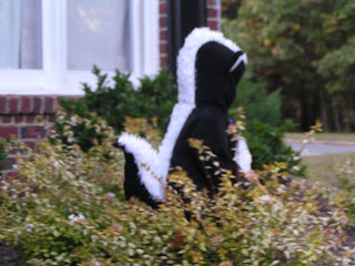 The stinky skunk made his debut this evening! He did a great job keeping the costume on and even managed to wear his stink face the entire night as well. So overall he made the perfect skunk, bad mood and all! But a super cute skunk he made!!